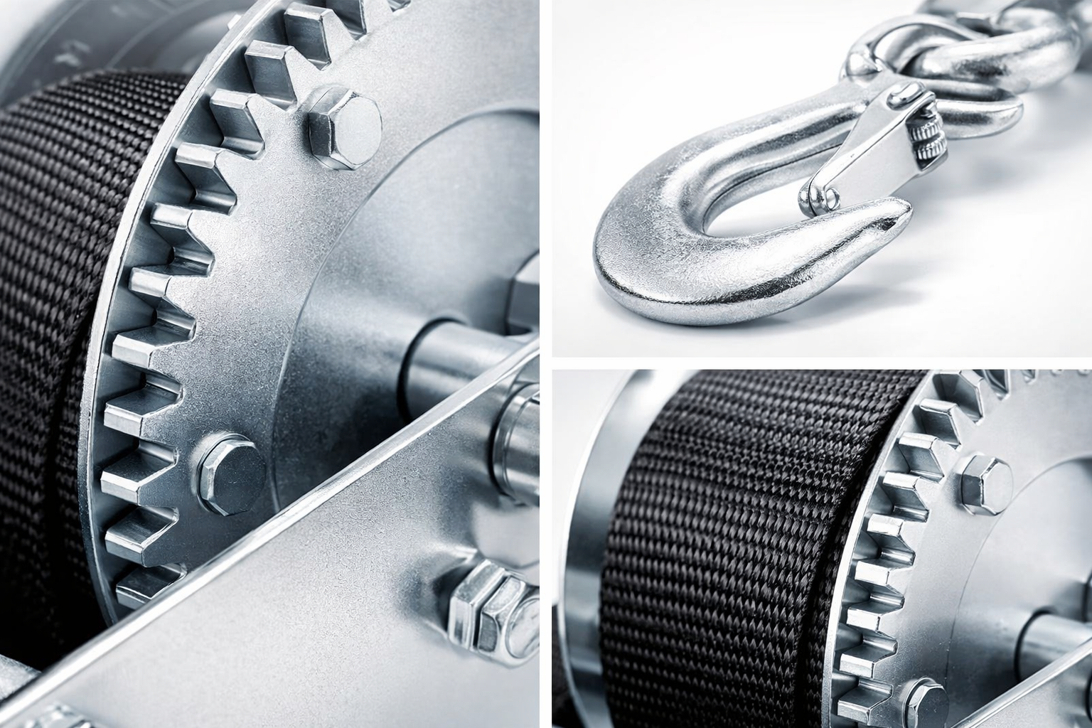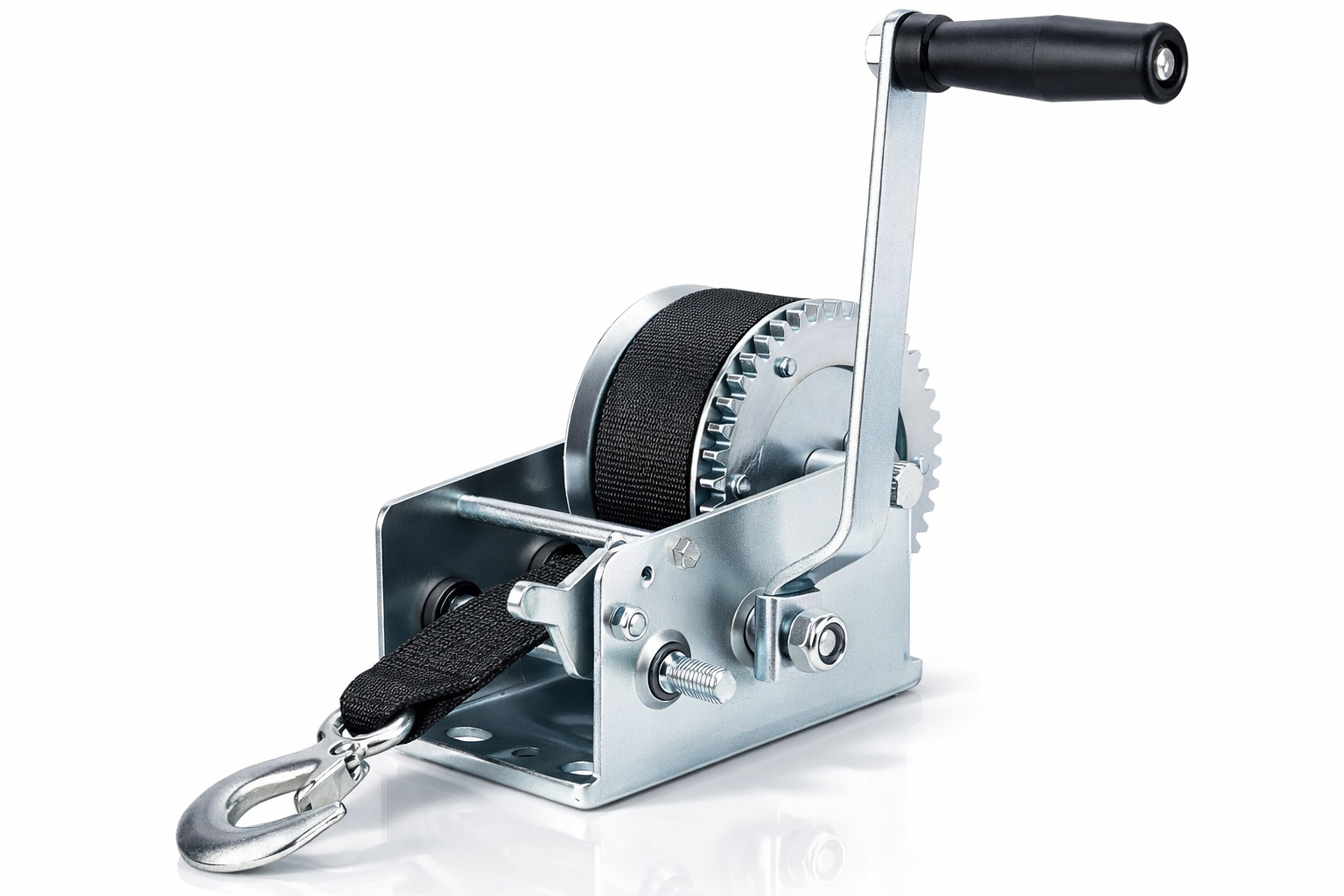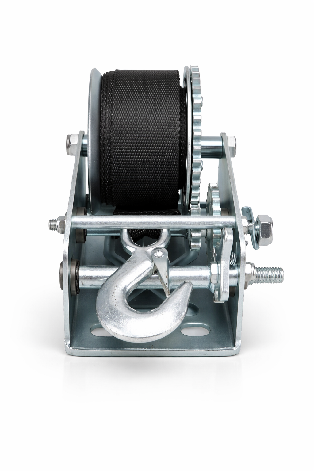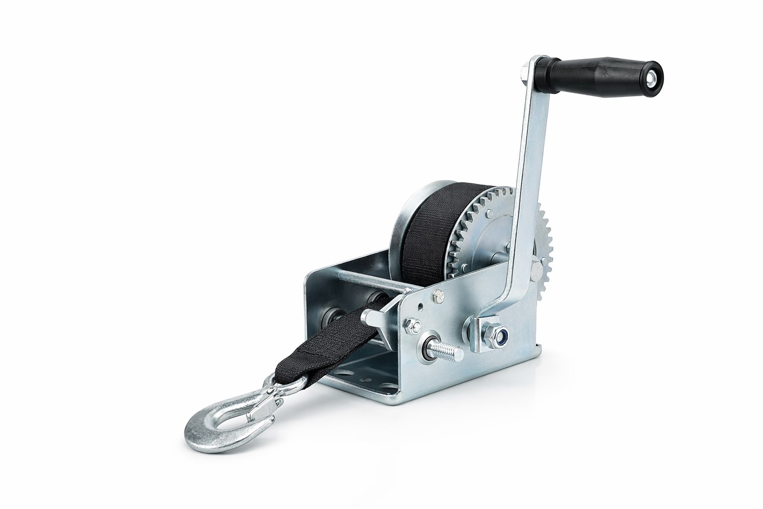 Built on a reinforced steel frame with a precision-cut gear mechanism, the BQW-2500 provides exceptionally smooth and efficient manual operation, even under sustained load. The winch is equipped with a heavy-duty 50mm webbing strap measuring 33 ft in length, offering superior load stability, reduced wear, and safer handling compared to traditional steel cables.