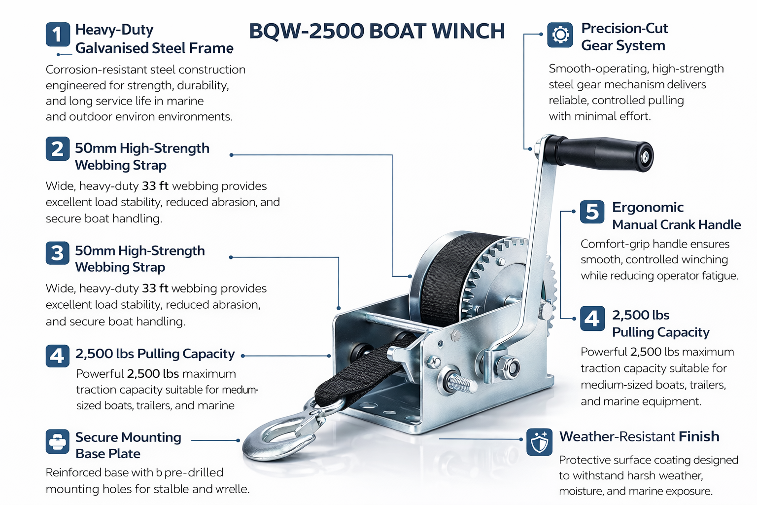 BQW-2500 Heavy-Duty Manual Boat Winch – 2,500 lbs Capacity