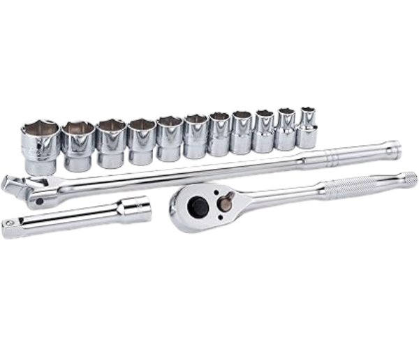 - 1 Reversible Ratchet Pear Head 1/2 in Drive 1 Articulated Handle 1/2 in Drive 1 6-Point CrV Steel Socket 1/2 in x 10 mm 1 6-Point CrV Steel Socket 1/2 in x 12 mm 1 6-Point CrV Steel Socket 1/2 in x 13 mm 1 6-Point CrV Steel Socket 1/2 in x 14 mm 1 6-Point CrV Steel Socket 1/2 in x 14 mm 1 6-Point CrV Steel Socket 1/2 in x 17 mm 1 6-Point CrV Steel Socket 1/2 in x 19 mm 1 6-Point CrV Steel Socket 1/2 in x 21 mm 1 6-Point CrV Steel Socket 1/2 in x 22 mm 1 6-Point CrV Steel Socket 1/2 in x 24 mm 1 CrV Steel 6-Point Socket 1/2 in x 27 mm, 1 CrV Steel Extension with 1/2 in Drive, Metal Case