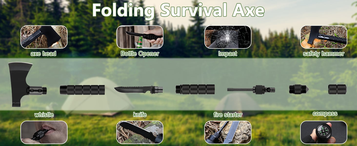 More than a standard hatchet, this complete outdoor solution integrates multiple survival essentials into one compact system. Features include a knife attachment, fire starter, emergency whistle, compass, hammer, bottle opener, glass breaker, fish scaler, and more—making it ideal for camping trips, hunting expeditions, hiking trails, fishing adventures, roadside emergencies, and bug-out kits.