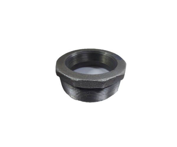 This bushing fitting is made of malleable iron and is designed for applications with a pressure up to 150 lbs. It has a black coating to protect the fitting during its lifetime, resulting in improved durability. The part has a hexagonal-shaped head so that it can be securely tightened with a wrench. The male and female threaded ends conform to the applicable standards and are 2 inches and 1 1/4 inch in nominal pipe size diameter.
