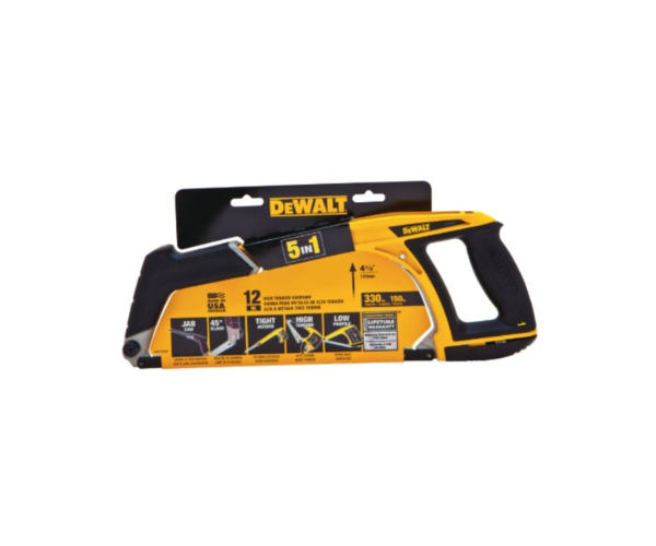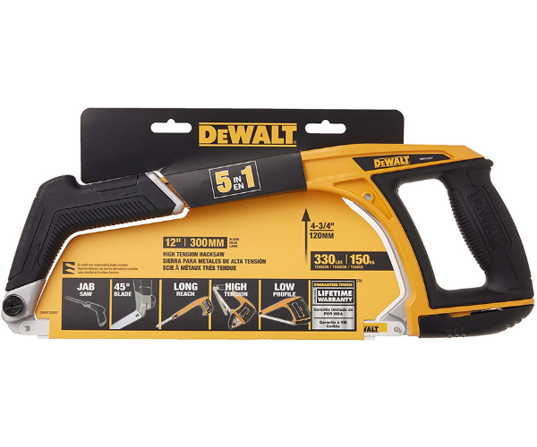 The DEWALT 5 in 1 Hacksaw has a 45° or 90° blade angle used for standard and flush cuts. The high tension securely holds the blade up to 330lbs. It has a low profile for cutting in tight spaces. The blade attaches to the front frame for long reach. The front handle becomes a jab saw.