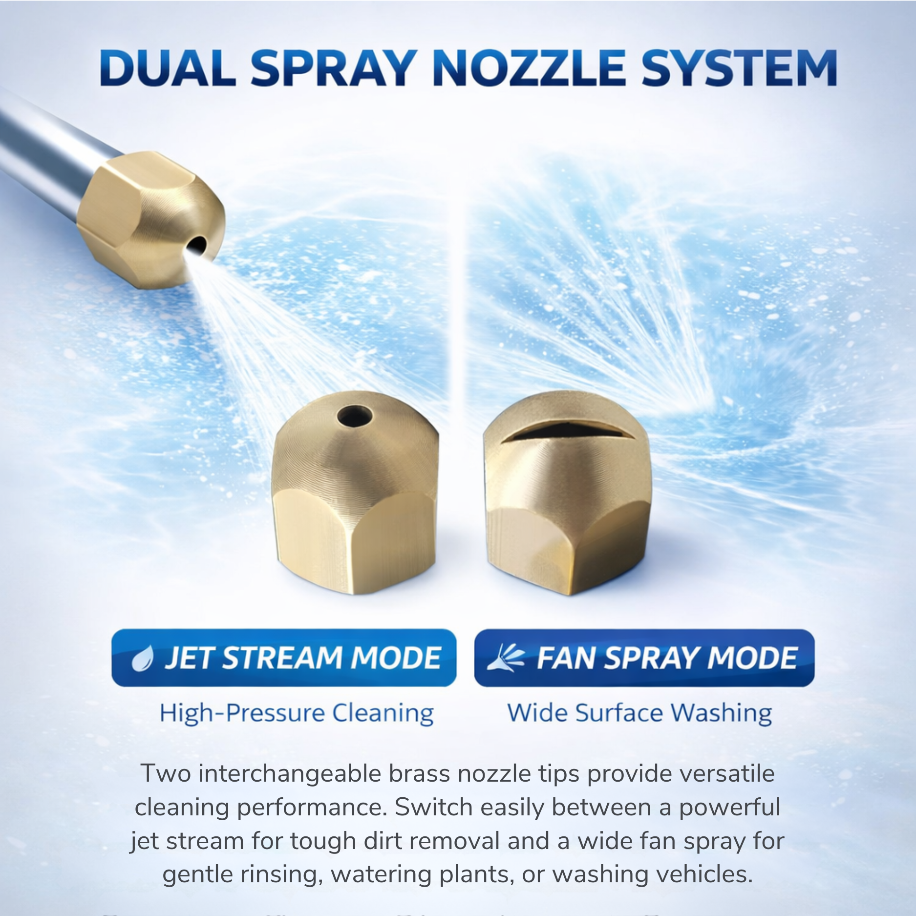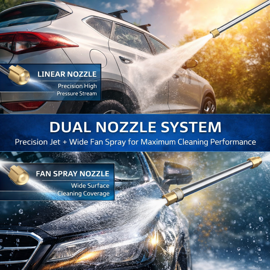 The system includes two interchangeable spray nozzles allowing users to easily switch between a focused linear jet stream for deep cleaning and a wide fan spray for gentle rinsing and surface washing.
