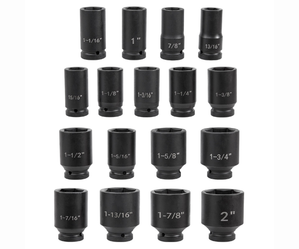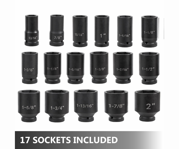 - 17 SOCKETS INCLUDED - This effort-saving 3/4 inch drive impact socket set comes with 17 deep impact drive sockets: 13/16'', 7/8’’, 15/16’’, 1’’, 1-1/16’’, 1-1/8’’, 1-3/16’’, 1-1/4’’, 1-5/16’’, 1-3/8’’, 1-7/16’’, 1-1/2’’, 1-5/8’’, 1-3/4’’, 1-13/16’’, 1-7/8’’, 2’’.