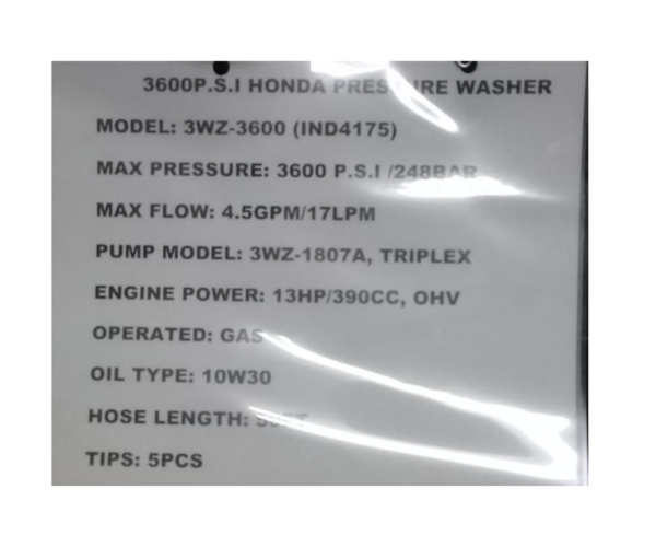 HONDAIND4175 3600 PSI,HONDA GASOLINE PRESSURE WASHER GX390, 13HP