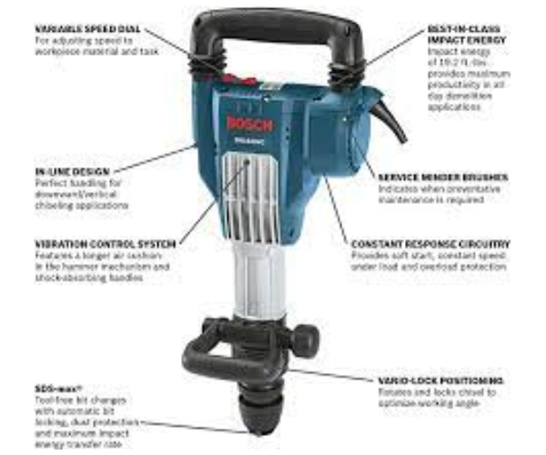 The Bosch DH1020VC SDS-max demolition hammer features an in-line design, for excellent weight distribution while chiseling concrete in downward or horizontal applications.