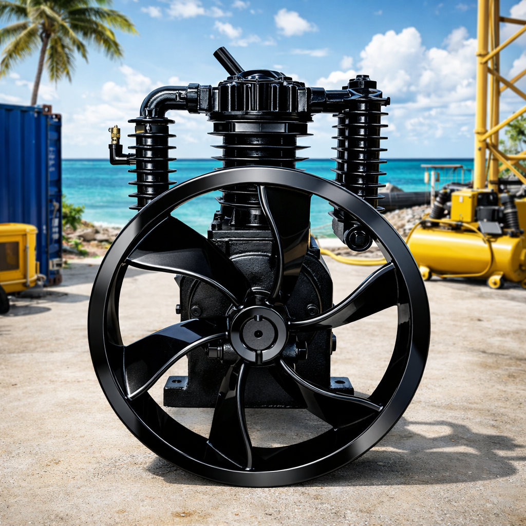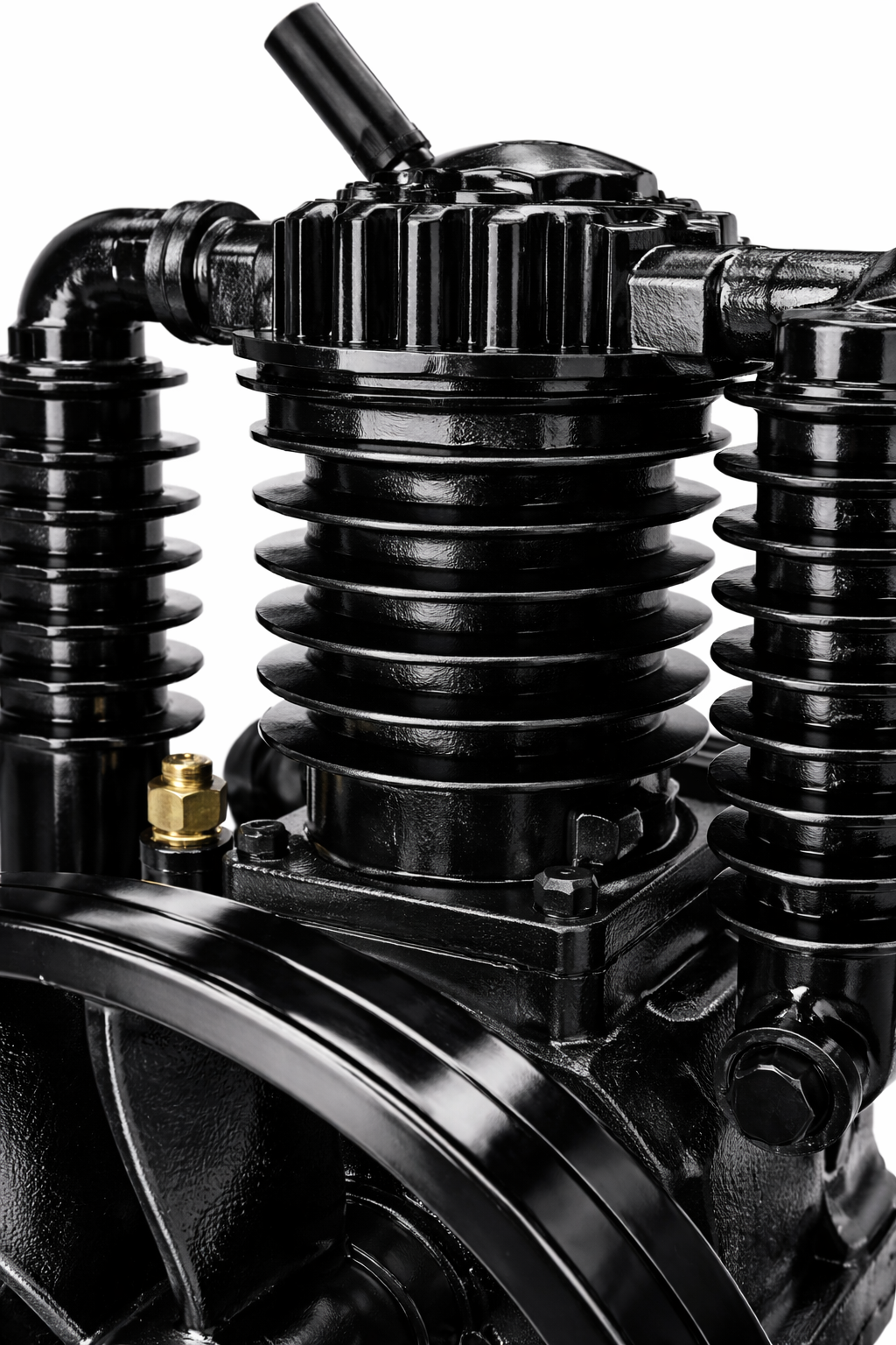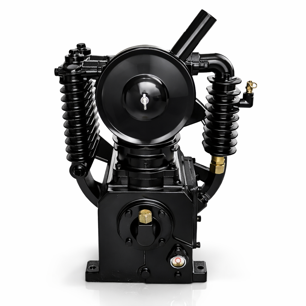Constructed from high-strength cast iron, the pump assembly is designed for durability, thermal stability, and extended service life. The dual-cylinder configuration with precision-machined bore sizes ensures smooth compression cycles, efficient air delivery, and reduced mechanical stress during prolonged operation.