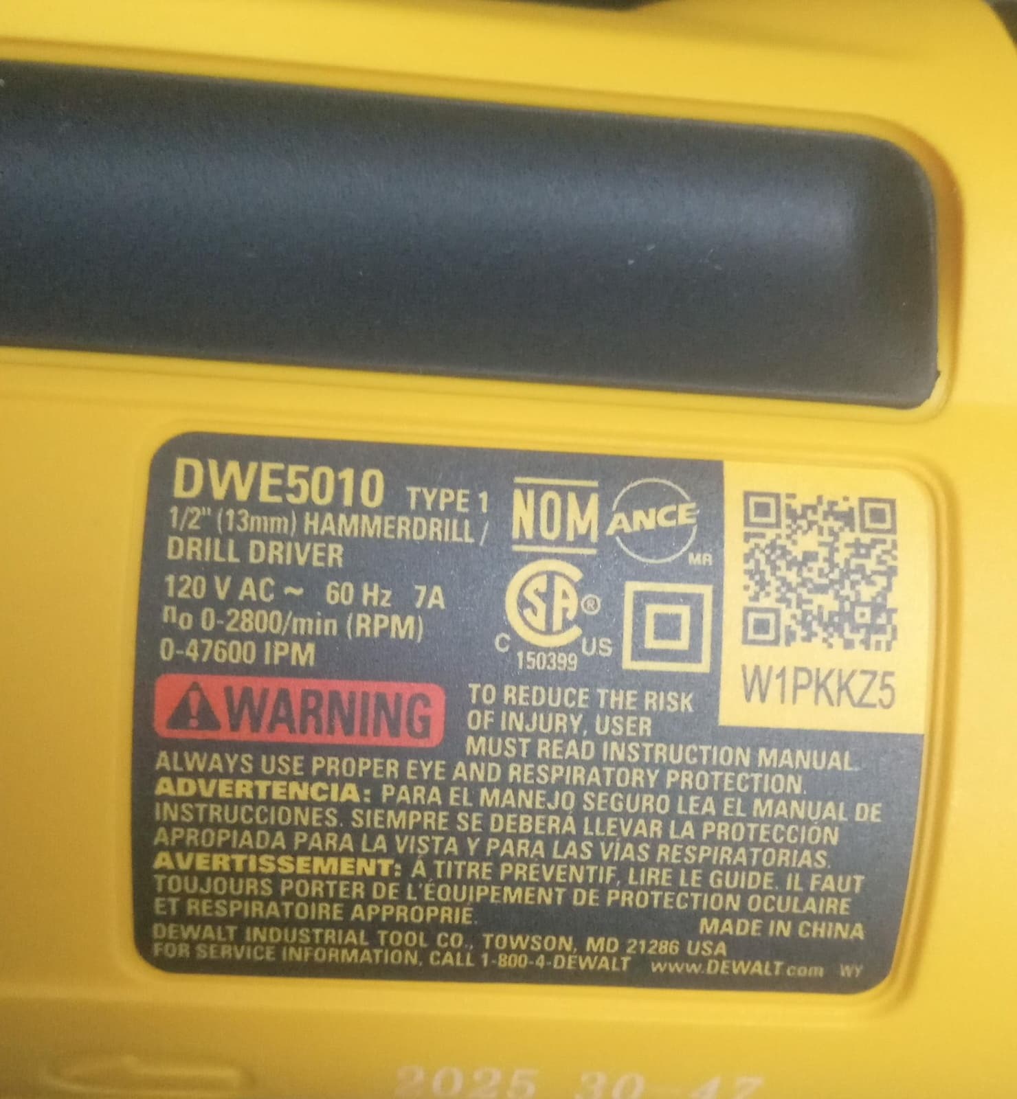 DEWALT IND6025/1/2" SINGLE SPEED HAMMER DRILL 120V 2800RPM 7.0AMP 550WATT/DWE5010