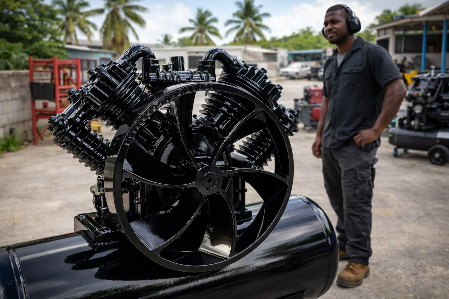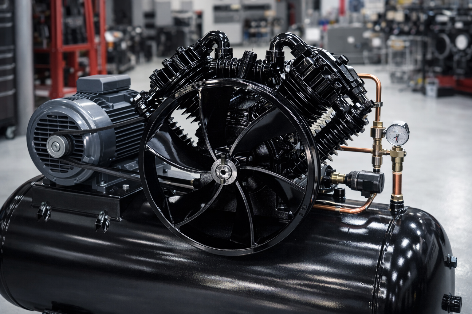 This balanced design provides smooth compression cycles and excellent volumetric efficiency, making it ideal for heavy pneumatic workloads.