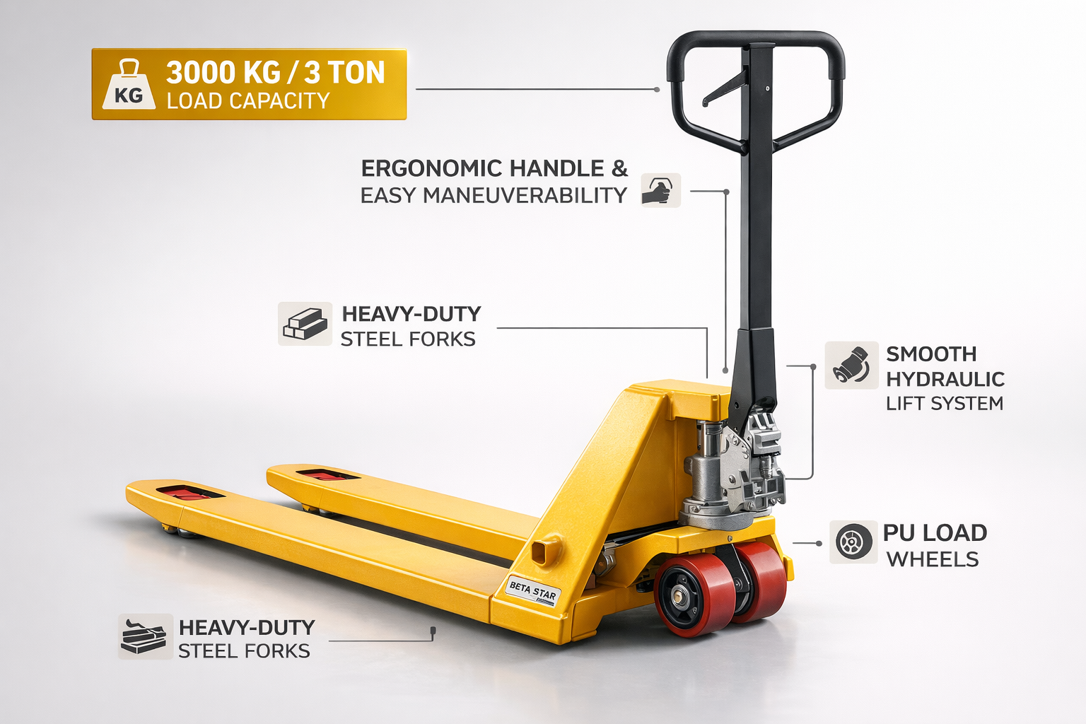 The BETA STAR 3 Ton Pallet Jack is a heavy-duty, reliable solution for everyday warehouse and industrial material handling. Built with a strong steel frame and protective coating, it is designed to safely lift and transport loads of up to 3000 kg with long-term durability.