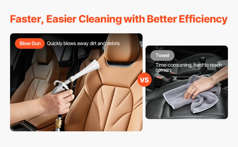 This air compressor gun easily blows away dirt and debris, quickly cleaning hard-to-reach spots and improving cleaning efficiency. Compared to towels that are time-consuming and ineffective at cleaning corners, it significantly boosts cleaning efficiency.