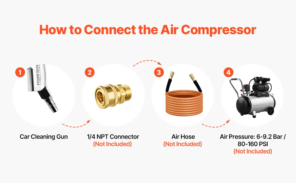 The cleaning gun connects easily to most industrial air compressors with just a few simple steps. Ensure your air compressor’s pressure range is 6-9.2 bar (80-160PSI) to ensure optimal cleaning performance. (Note: The 1/4 NPT connector and air hose are not included in package.)