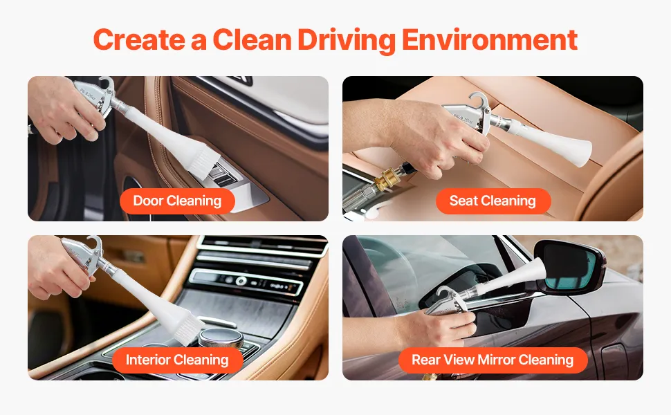 The vortex air gun meets a variety of cleaning needs, easily tackling tasks like cleaning car doors, seats, interiors, and rear view mirrors. It quickly removes stubborn stains and cleans hard-to-reach corners, making your car look brand new.