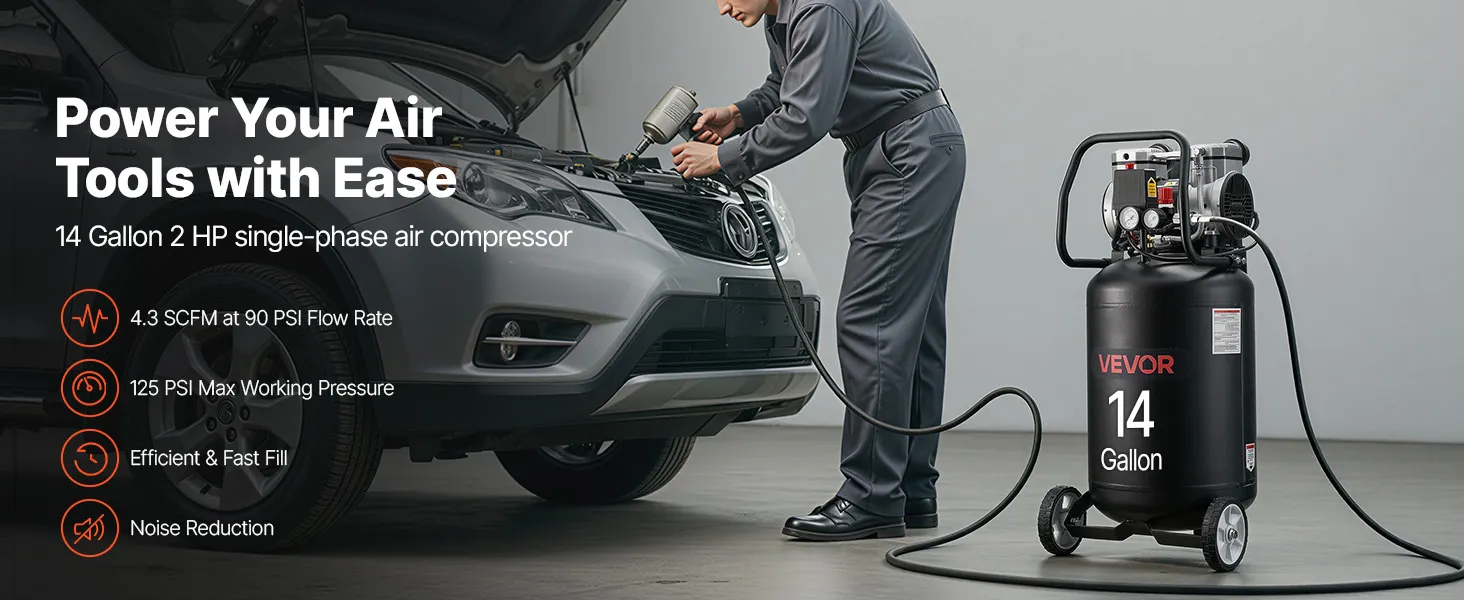 Are you looking for a faster, stronger, and more durable air compressor to upgrade your workspace? VEVOR 14-gallon air compressor features a 2 HP motor, 4.3 SCFM at 90 PSI airflow, and 125 PSI max working pressure — ideal for paint spraying, tire inflation, auto repairs and woodworking projects.