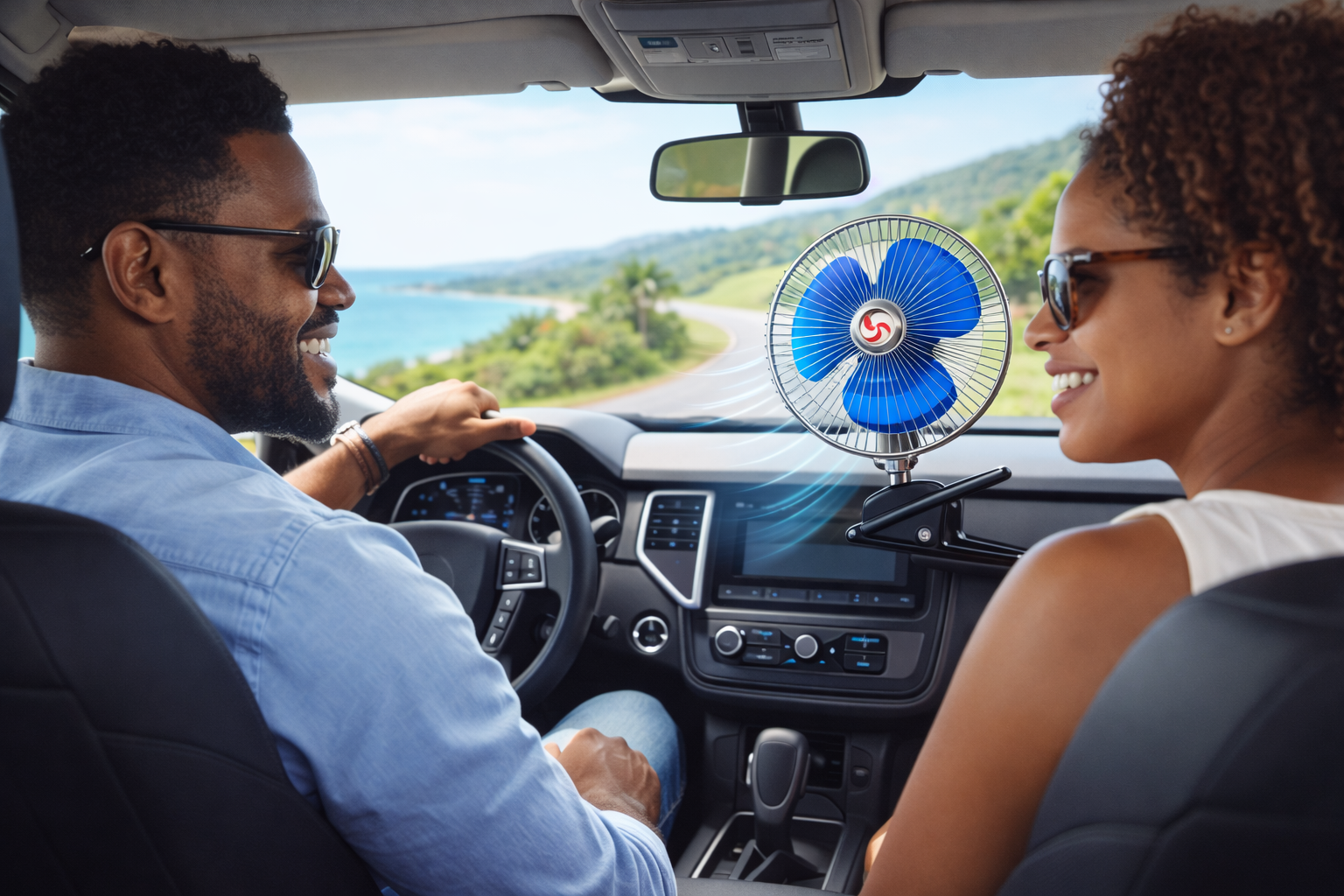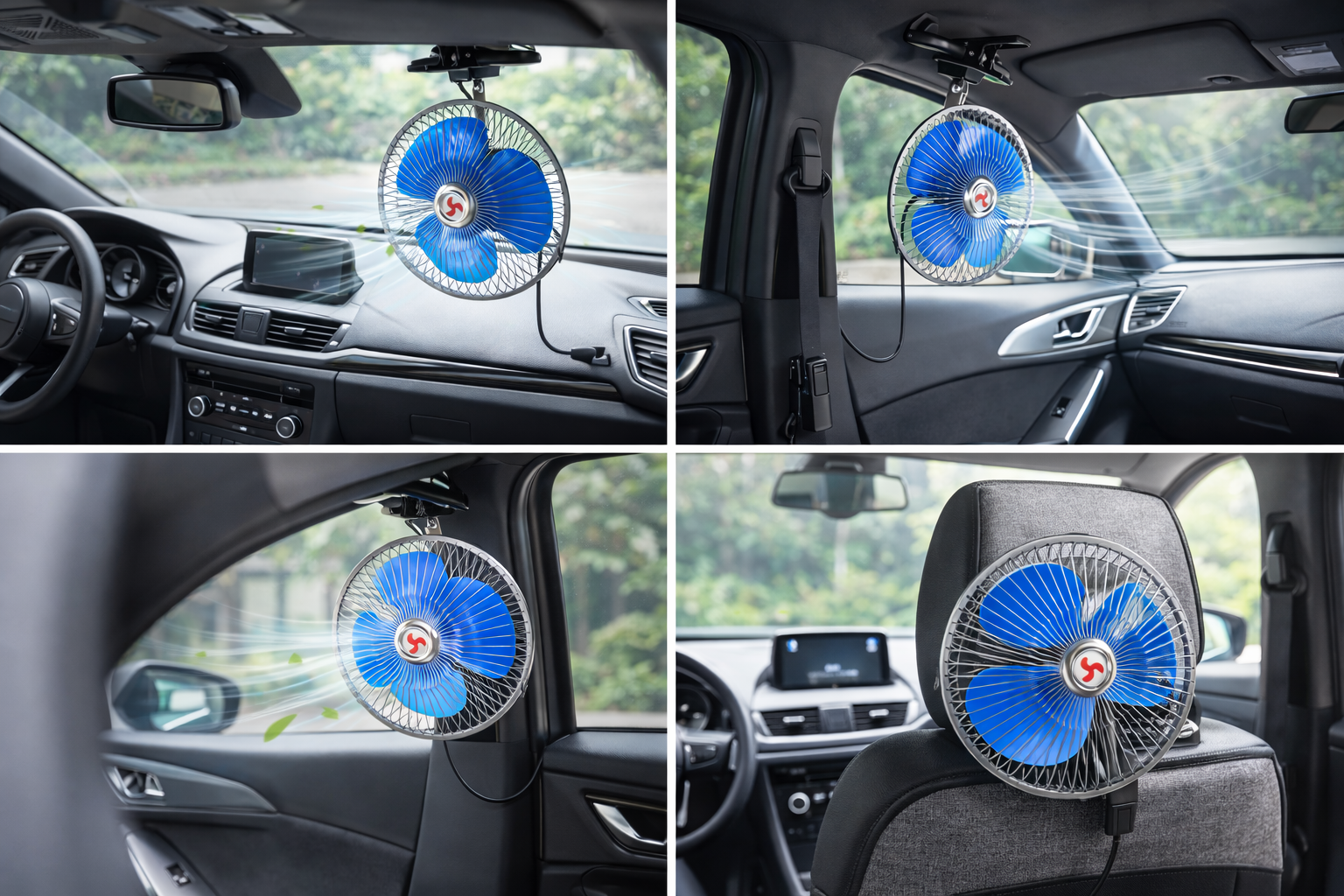 Installation is quick and secure thanks to the heavy-duty clamp mounting base, which enables firm attachment to dashboards, rails, or other suitable mounting surfaces. Its compact 6-inch size delivers effective airflow while occupying minimal space—perfect for vehicle cabins where space is limited.