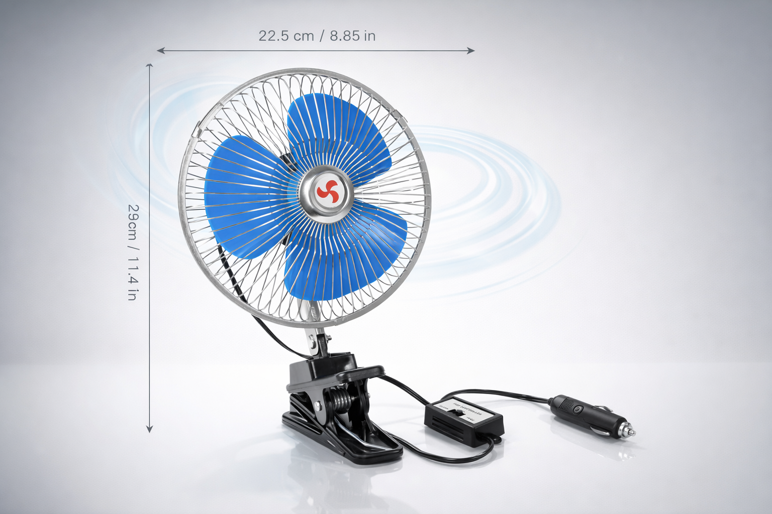 Featuring a built-in oscillation mechanism, the fan distributes air evenly across the cabin, improving ventilation and driver comfort in hot or humid conditions. The adjustable tilt head allows precise control of airflow direction, making it ideal for focused cooling, window defogging, or general cabin air circulation.