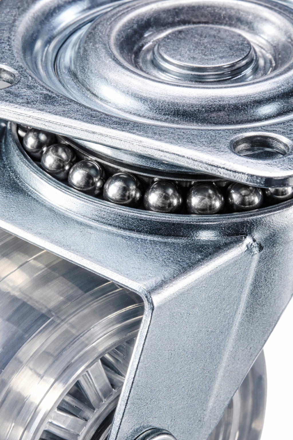 The caster features a 3-inch diameter clear polyurethane wheel with a 1-1/8″ wheel width, providing stable load distribution and controlled rolling performance. Its 360° swivel action, supported by a ball-bearing swivel raceway, ensures effortless directional changes, even in confined spaces.