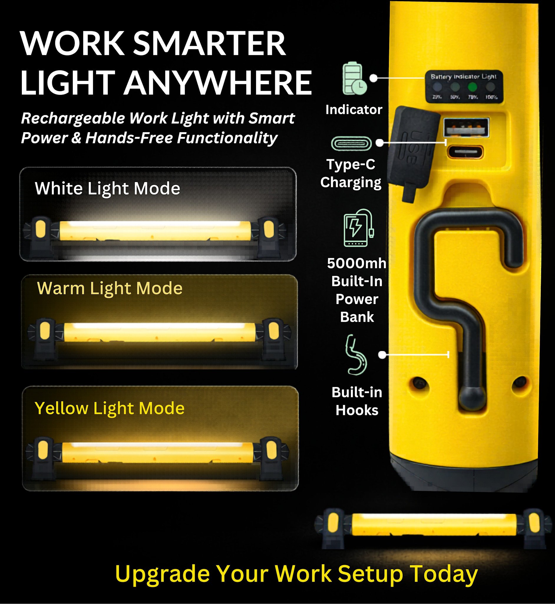 Built with a rugged ABS body, this work light is made to withstand tough environments while offering the convenience of a built-in power bank to keep your devices charged when you need them most.